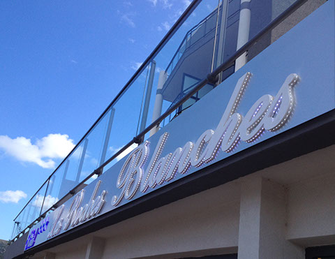Enseigne panneau dibond avec lettrage PVC blanc recouvert de vinyle découpé + éclairage LED